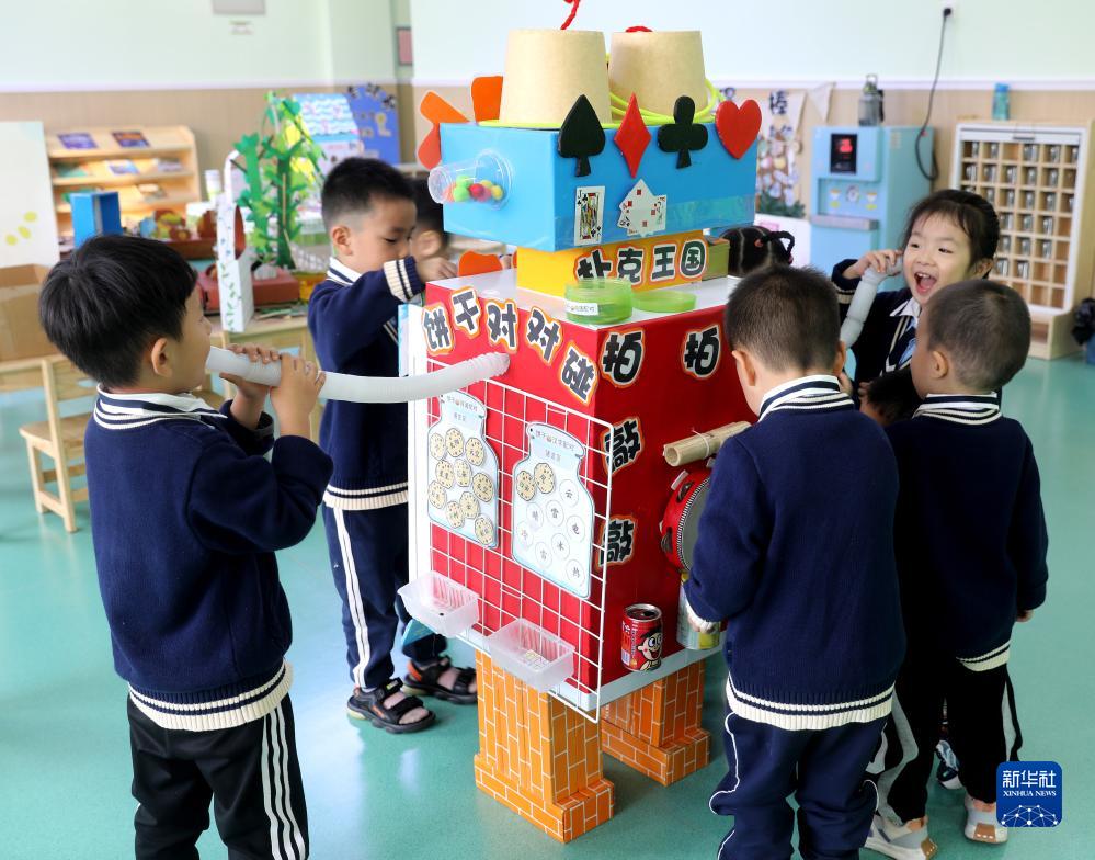 10月31日,在山東省滕州市龍泉街道中心幼兒園,小朋友們在“調試”用廢舊物品制成的“多功能機器人”。