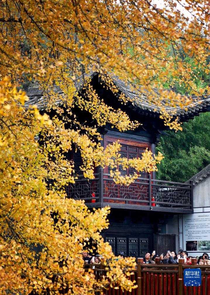 深秋時(shí)節,陜西省西安市長(cháng)安區終南山古觀(guān)音禪寺內的千年銀杏滿(mǎn)目金黃,吸引游客參觀(guān)游覽。