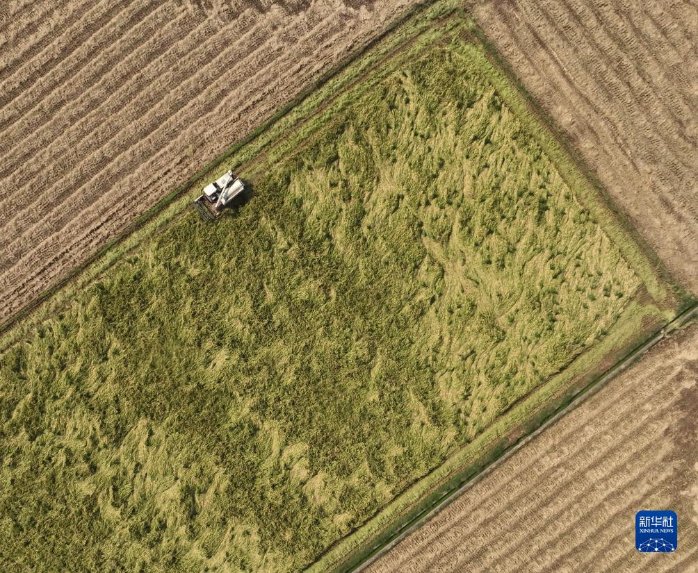 10月30日,在湖南省衡陽(yáng)市衡山縣白果鎮,當地村民駕駛農機收割晚稻(無(wú)人機照片)。