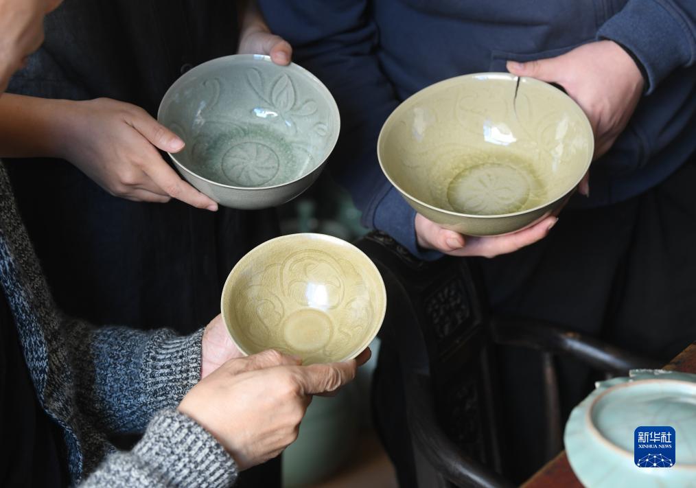 10月31日,在陶瓷文化學(xué)者蔡劍青的家中,季雙俊和季資美拿著(zhù)他們試做的刻劃花碗和北宋龍泉窯的碗(下)做比較。