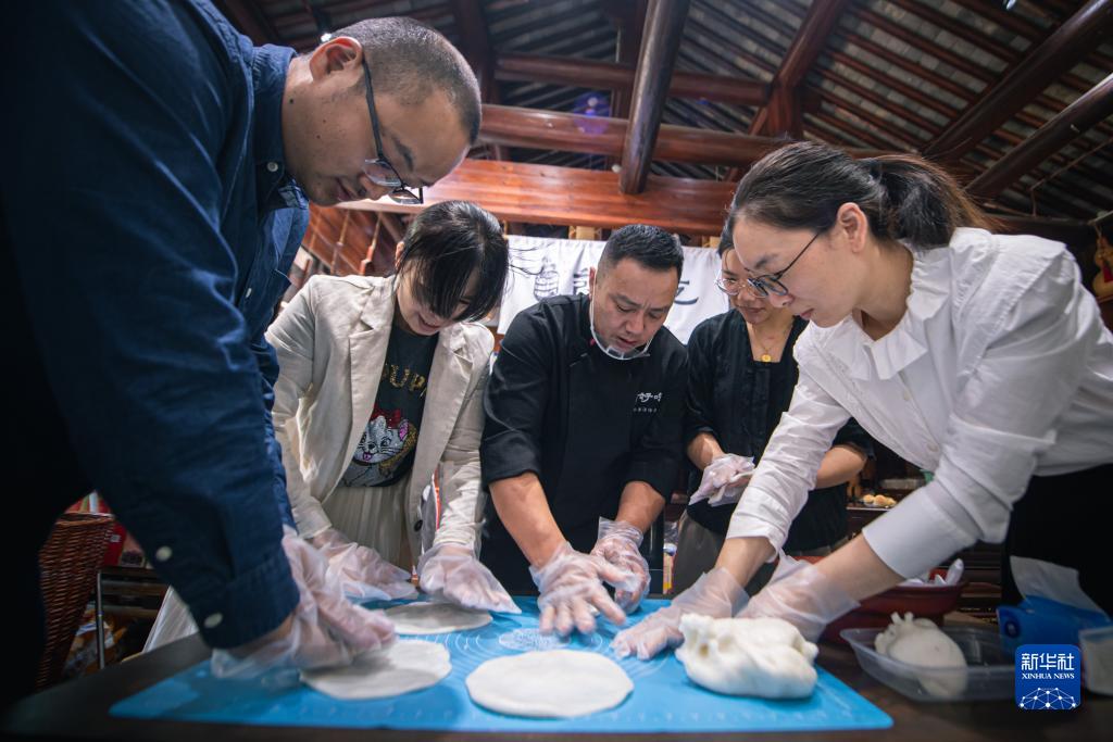 11月1日,在慈城古縣城景區內,年糕食品店主包珅(左三)帶領(lǐng)游客體驗年糕餃的制作。