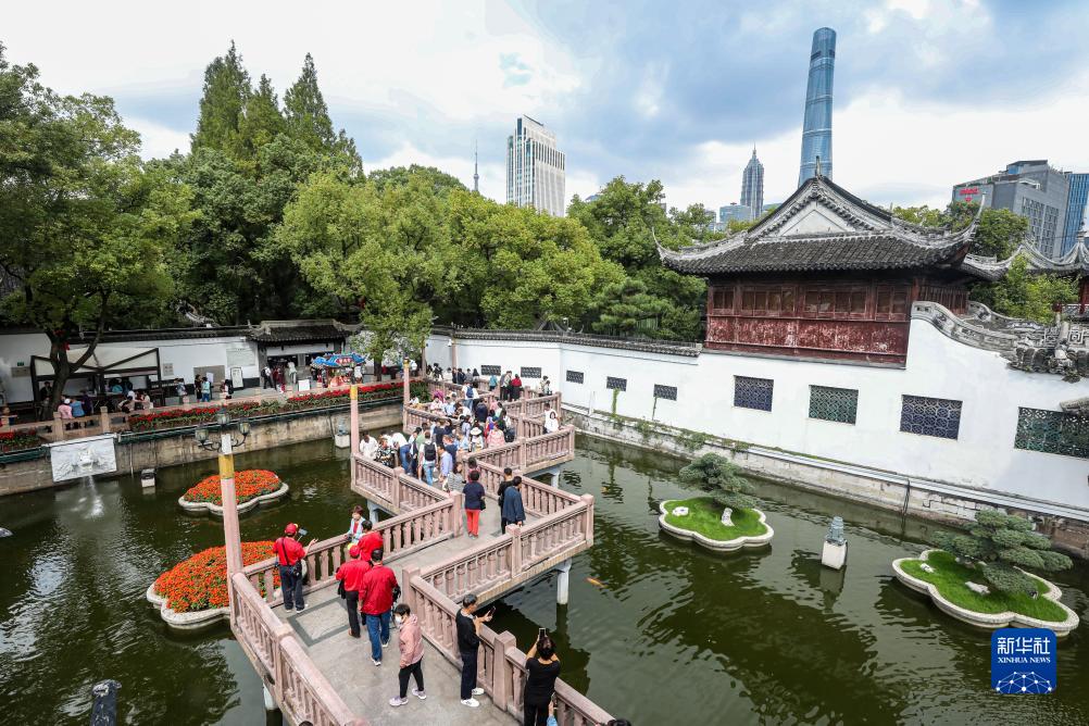 10月12日,游客在上海豫園的九曲橋上游覽。