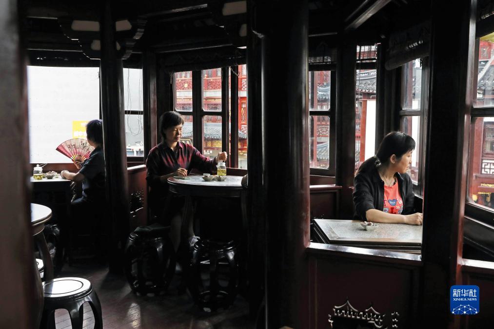 10月12日,人們在上海豫園的九曲橋湖心亭茶樓喝茶。湖心亭茶樓是上?,F存最古老的茶樓。