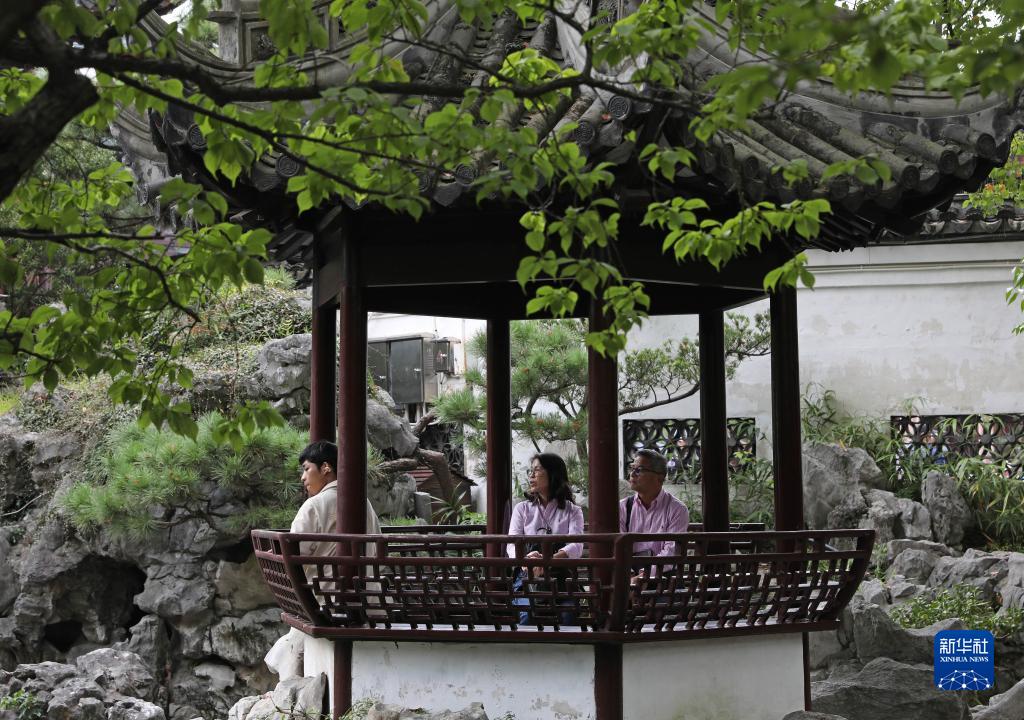 10月12日,人們在上海豫園的亭子中休息。