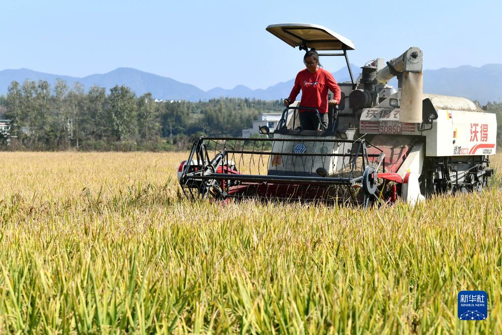 11月1日,在湖北省咸寧市通城縣四莊鄉向家村,種糧大戶(hù)駕駛收割機在田間收割晚稻。