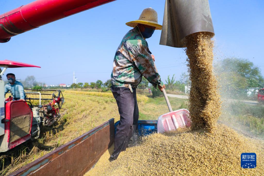 10月31日,在河南省信陽(yáng)市光山縣仙居鄉張灣村,一家合作社社員在收獲晚稻。