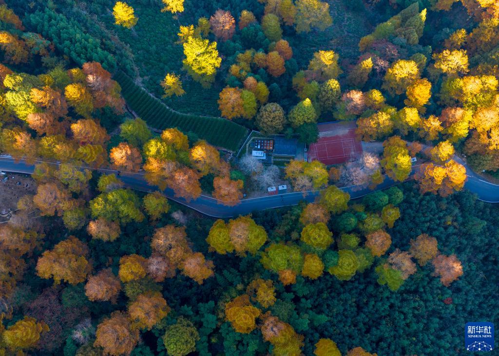 11月1日在浙江省湖州市安吉縣山川鄉九畝村金錢(qián)松公園拍攝的秋景(無(wú)人機照片)。