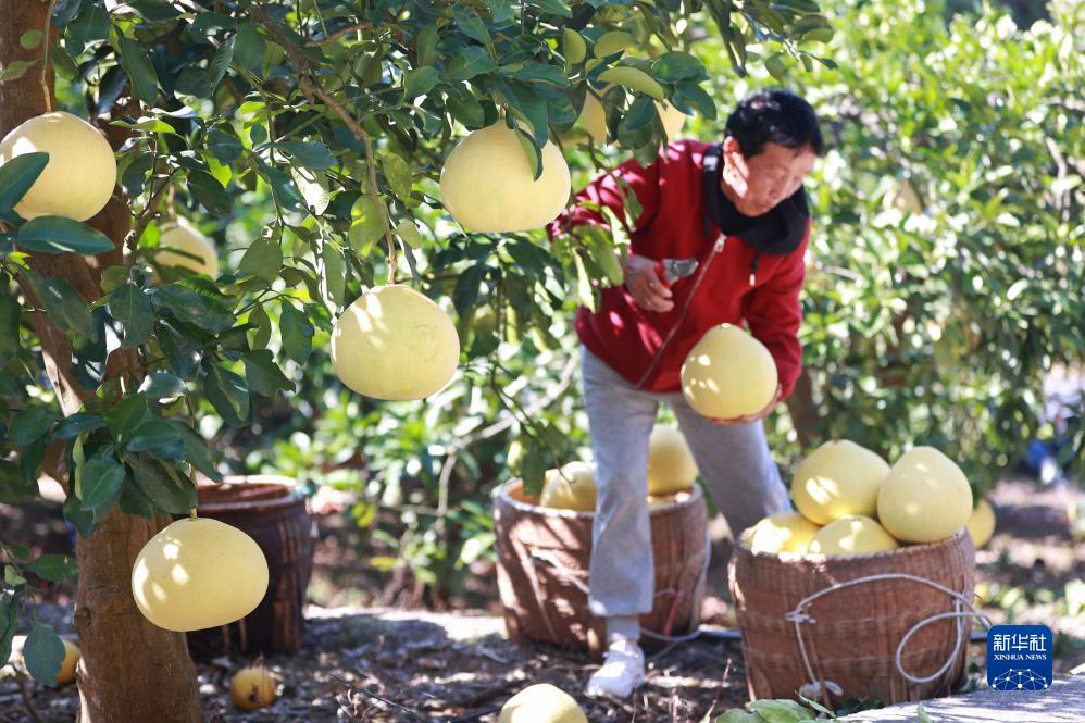 11月1日,村民在貴州省岑鞏縣注溪鎮周坪村思州柚種植基地采收柚子。