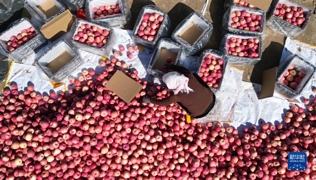 10月31日,果農在甘肅省永靖縣峴塬鎮劉家村蘋(píng)果基地分揀包裝蘋(píng)果(無(wú)人機照片)。