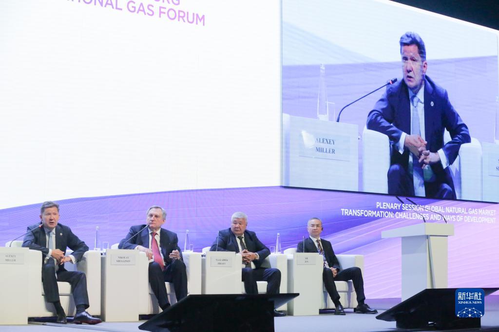 11月1日,在俄羅斯圣彼得堡舉行的第十二屆圣彼得堡國際天然氣論壇全體會(huì )議上,俄羅斯天然氣工業(yè)股份公司總裁阿列克謝·米勒(左一)發(fā)言。