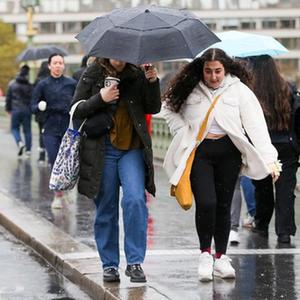 11月2日,在英國倫敦,人們打著(zhù)傘走在威斯敏斯特橋上。