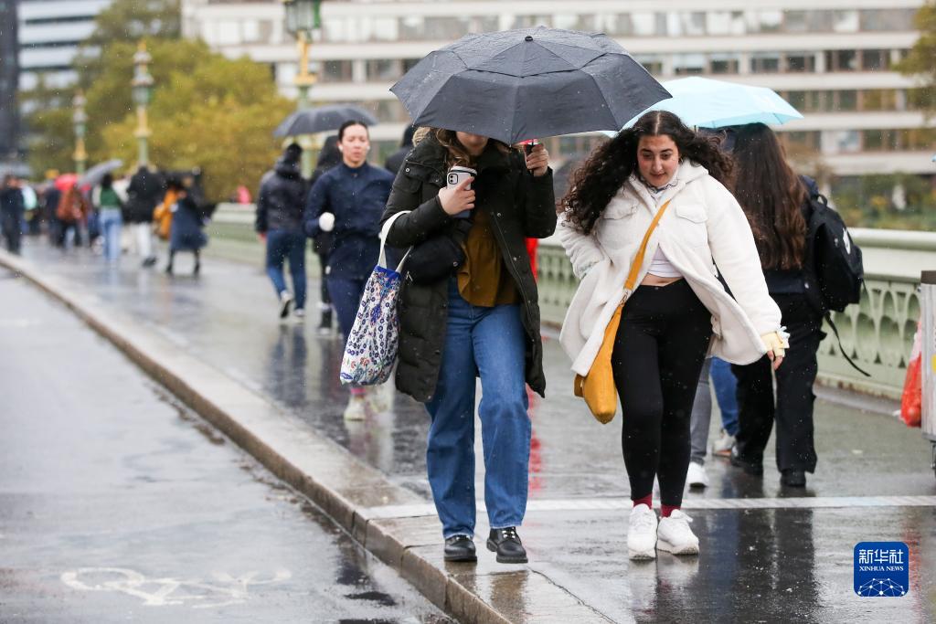 11月2日,在英國倫敦,人們打著(zhù)傘走在威斯敏斯特橋上。