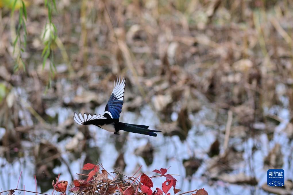 11月3日,一只喜鵲在北京頤和園耕織圖景區覓食。