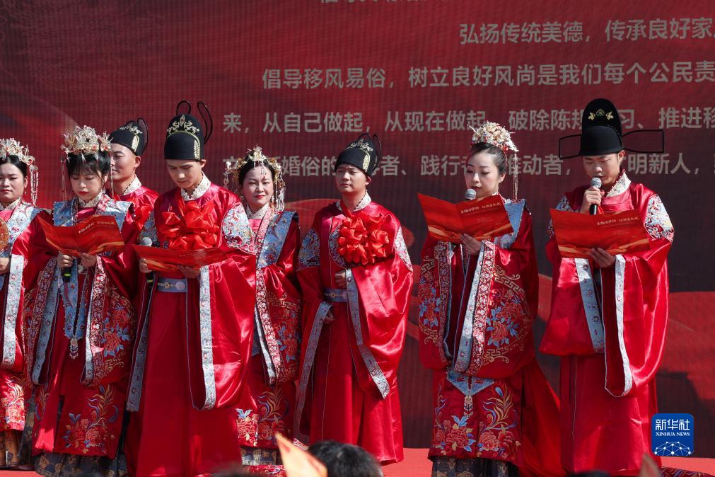 11月3日,參加集體婚禮的新人們宣讀《婚俗改革倡議書(shū)》,發(fā)出推進(jìn)移風(fēng)易俗、婚俗改革的倡議。