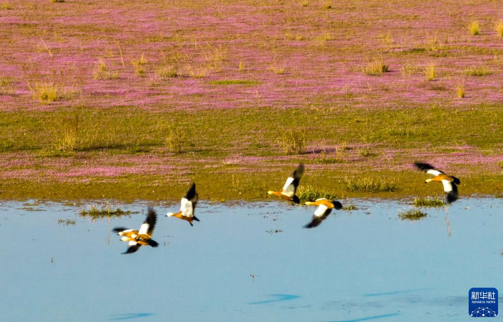 11月1日在江西鄱陽(yáng)湖都昌濕地拍攝的蓼子花海(無(wú)人機照片)。