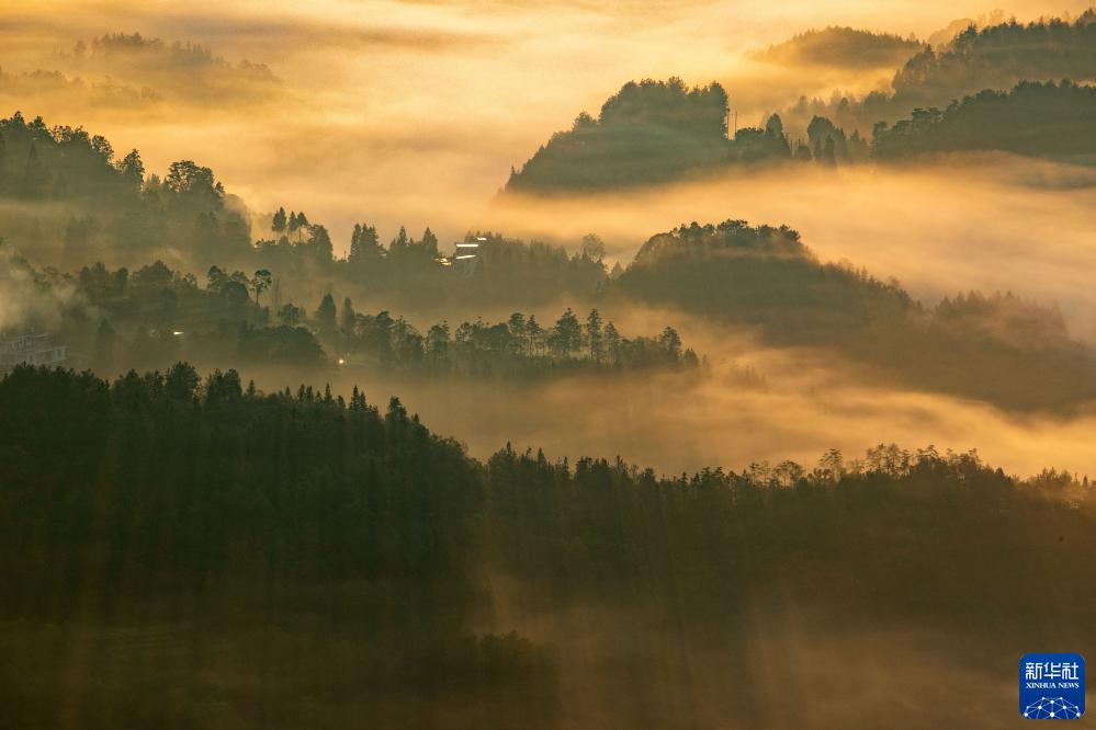 11月1日在貴州省遵義市正安縣拍攝的山間晨霧景色。
