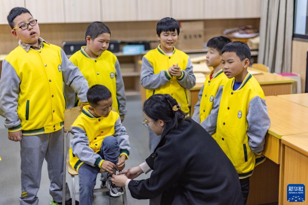 10月30日,在重慶市特殊教育中心的教室內,一名二年級的視力障礙學(xué)生在老師指導下學(xué)習系鞋帶。