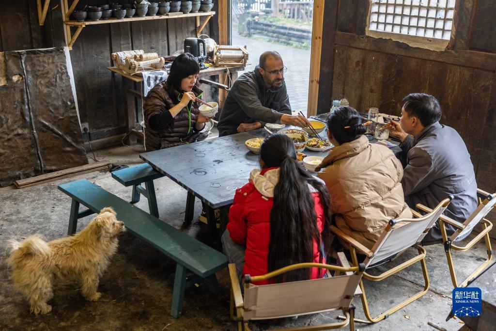 10月25日,在重慶市城口縣北屏鄉松柏村,文森和徒弟們在工作室內吃午餐。