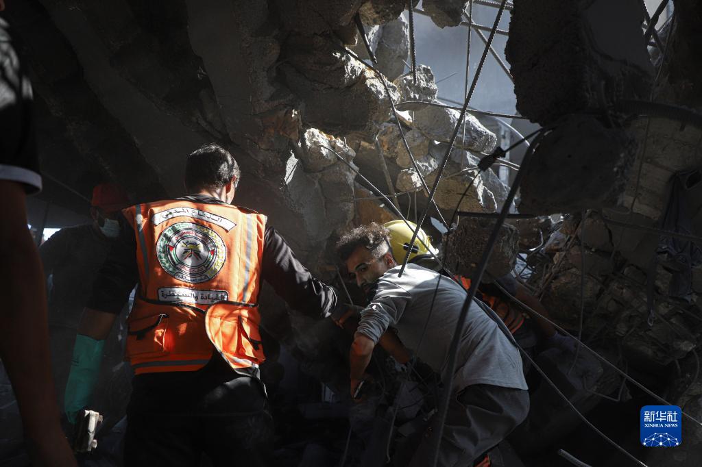 11月3日,在加沙地帶南部城市汗尤尼斯,人們在遭襲擊后的建筑廢墟上實(shí)施救援。