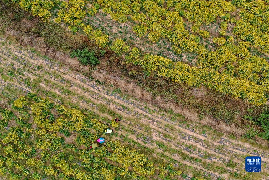 11月3日,村民在神秀谷田園綜合體內收獲菊花(無(wú)人機照片)。
