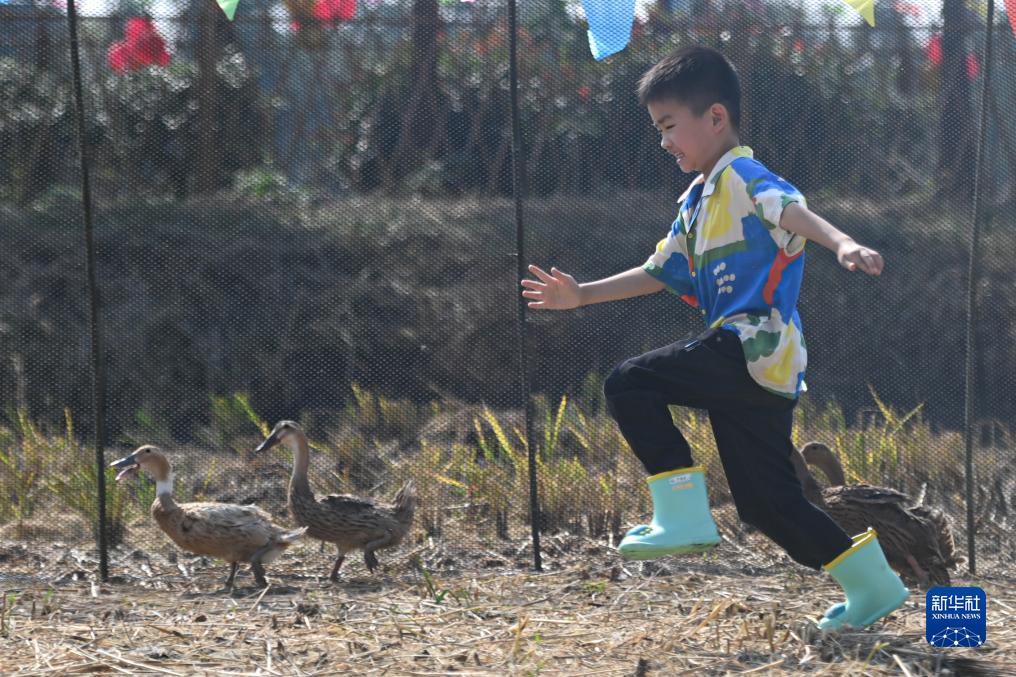 11月4日,小朋友在南潯區雙林鎮萬(wàn)畝稻蝦綜合種養示范區的稻田游園會(huì )捉鴨子。