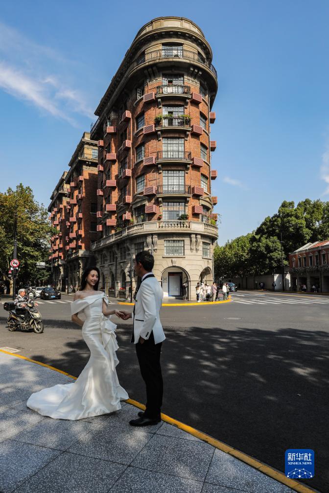 11月3日,人們在武康大樓前拍攝婚紗照。