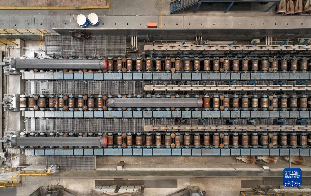11月4日,在承德市營(yíng)子區一家特殊鋼生產(chǎn)企業(yè),工人操作傳送設備運送連鑄圓坯(無(wú)人機照片)。