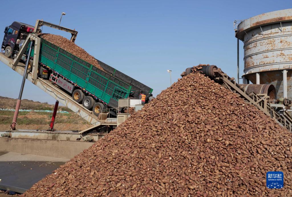 11月4日,河北省盧龍縣一家甘薯深加工企業(yè)的工人在卸載從農民手中收購的甘薯。