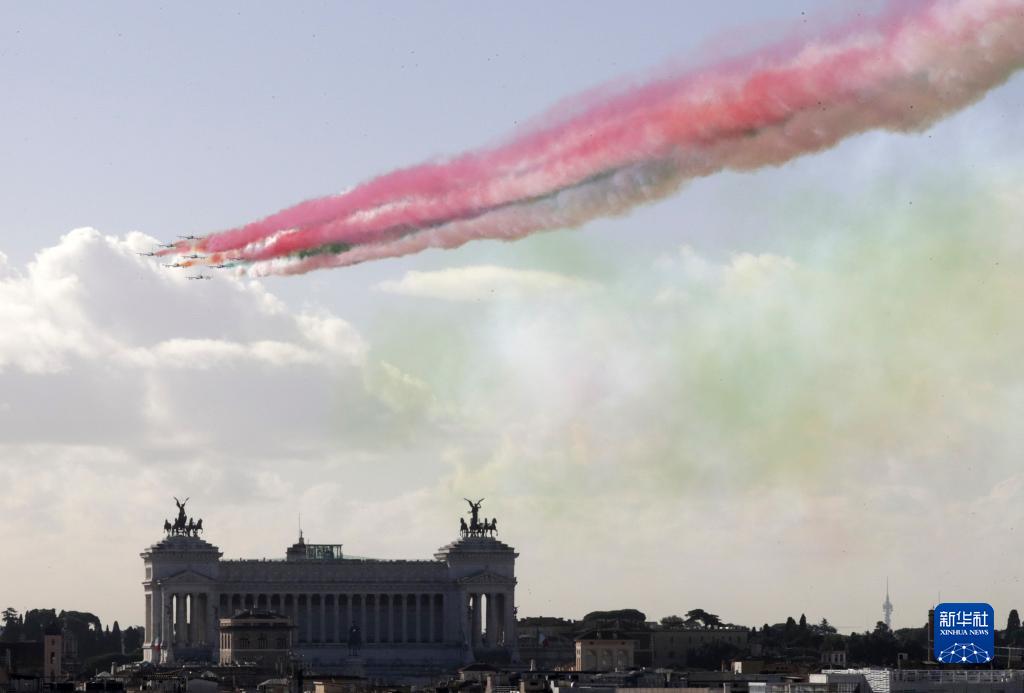 11月4日,意大利“三色箭”飛行表演隊噴出象征國旗三色的煙霧飛過(guò)羅馬上空,慶祝國家團結日。
