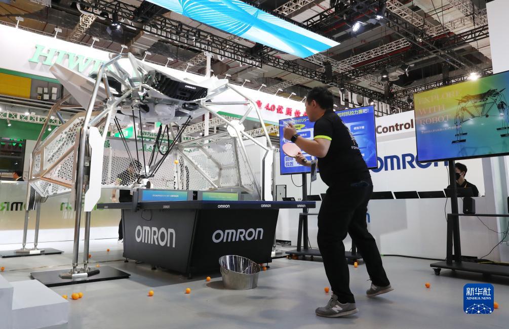 11月5日,工作人員(右)在第六屆進(jìn)博會(huì )上展示歐姆龍公司展出的第八代FORPHEUS乒乓球教練機器人。