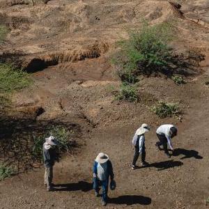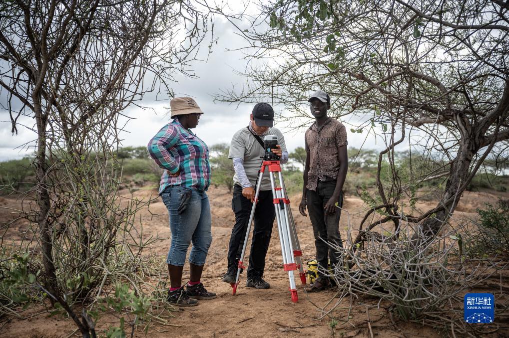 11月3日,中肯聯(lián)合考古隊隊員婁文臺(中)在位于肯尼亞巴林戈郡馬里加特鎮的考古現場(chǎng)架設基站。