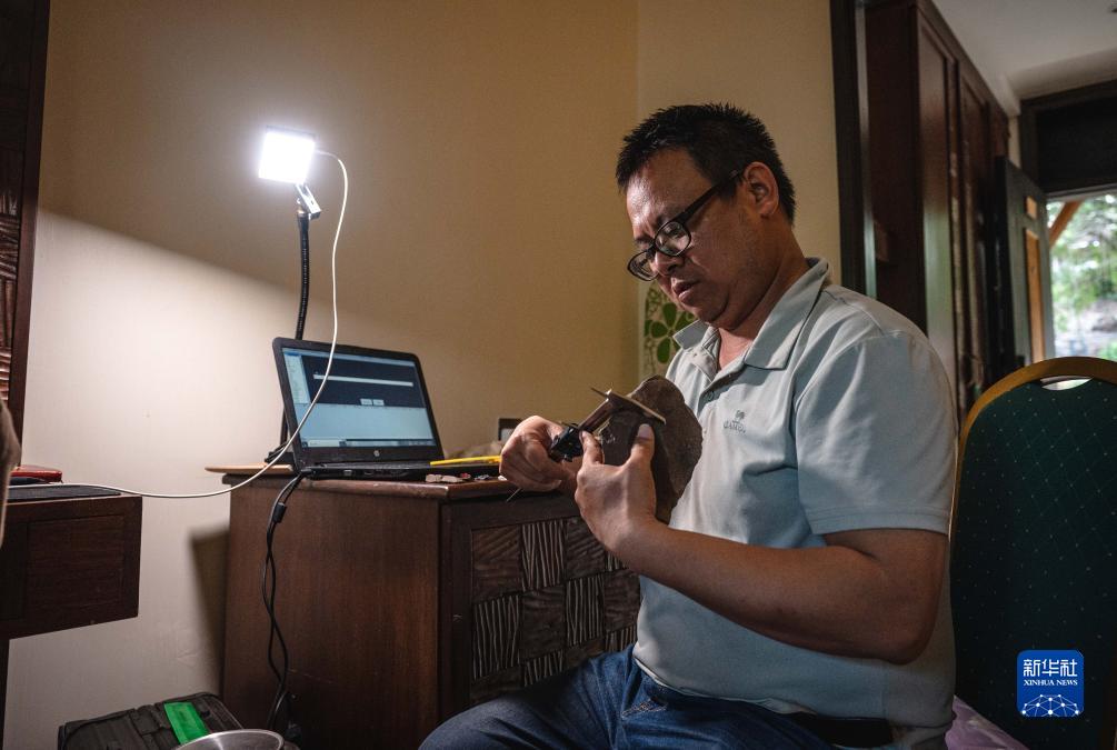 11月3日,中肯聯(lián)合考古隊隊員顧雪軍在位于肯尼亞巴林戈郡馬里加特鎮的臨時(shí)駐地內進(jìn)行測量工作。