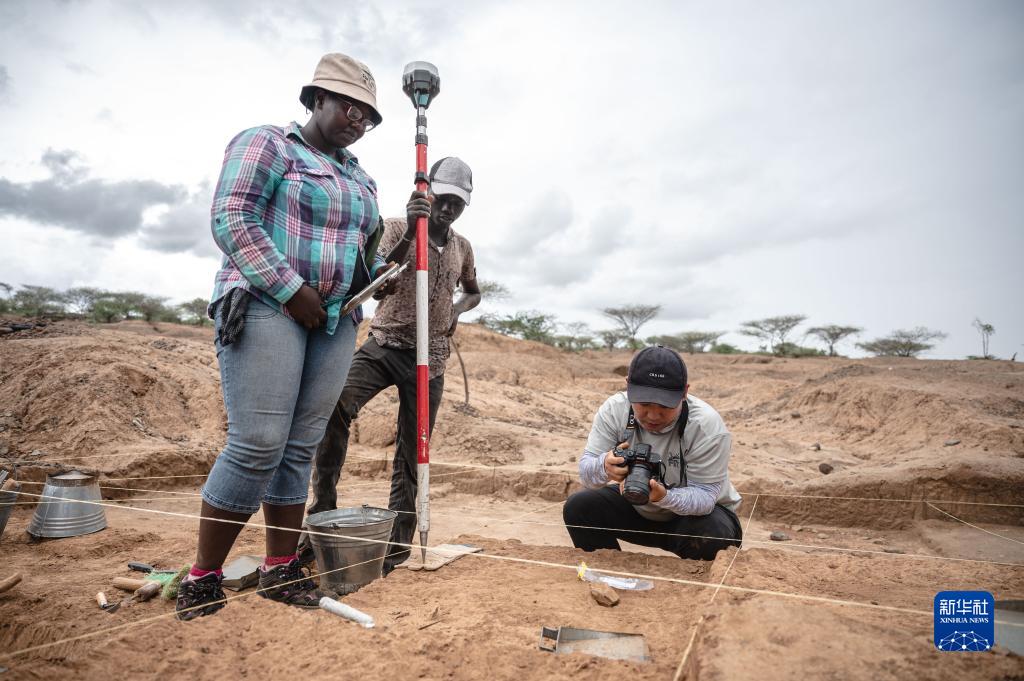 11月3日,中肯聯(lián)合考古隊隊員婁文臺(右)在位于肯尼亞巴林戈郡馬里加特鎮的考古現場(chǎng)拍攝發(fā)掘出的石器。