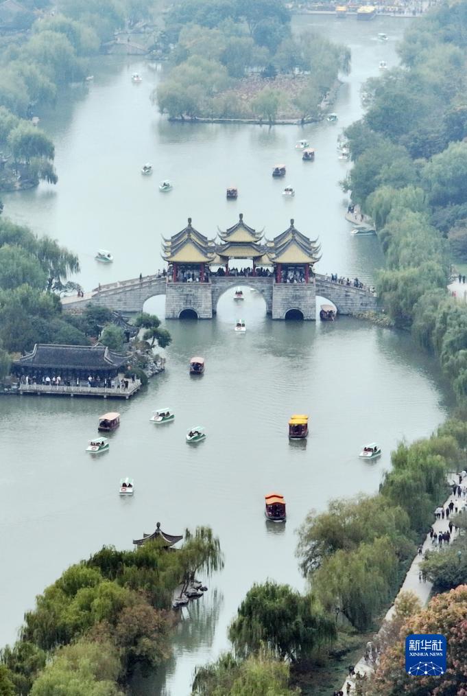 11月4日,游客在江蘇揚州瘦西湖風(fēng)景區游玩(無(wú)人機照片)。