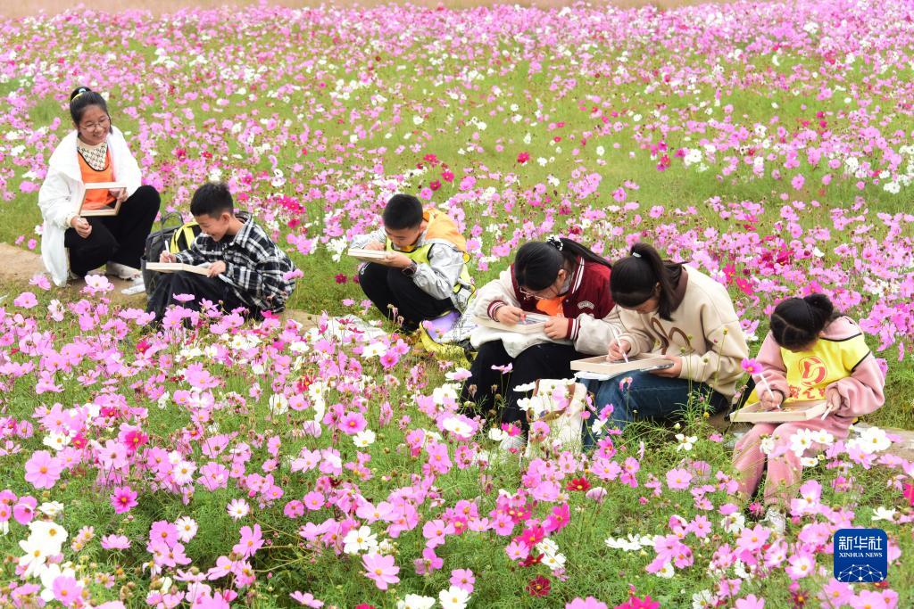 11月4日,在湖南省常德市澧縣城頭山國家考古遺址公園,學(xué)生在花海里寫(xiě)生。