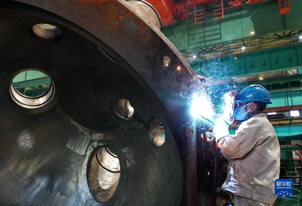 11月5日,工人在秦皇島經(jīng)濟技術(shù)開(kāi)發(fā)區哈電集團(秦皇島)重型裝備有限公司的生產(chǎn)車(chē)間工作。