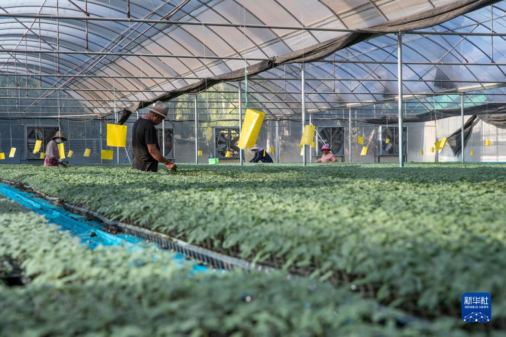 工人在云南元謀現代種業(yè)科技園育苗工廠(chǎng)大棚內查看種苗生長(cháng)情況(11月5日攝)。