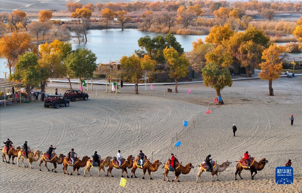 游客在新疆尉犁縣羅布人村寨景區騎駱駝?dòng)斡[觀(guān)光(11月3日攝,無(wú)人機照片)。