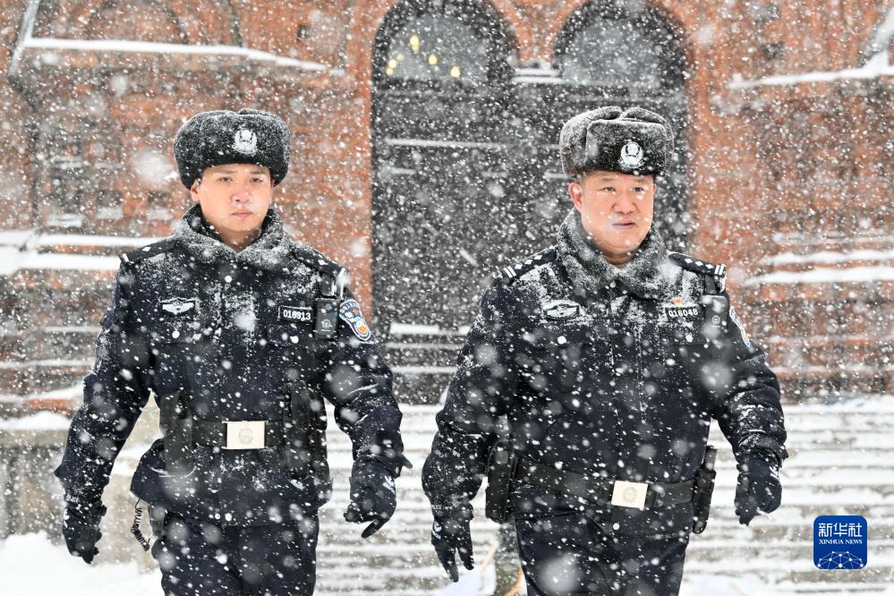 11月6日,警察在哈爾濱建筑藝術(shù)館外冒雪巡邏。