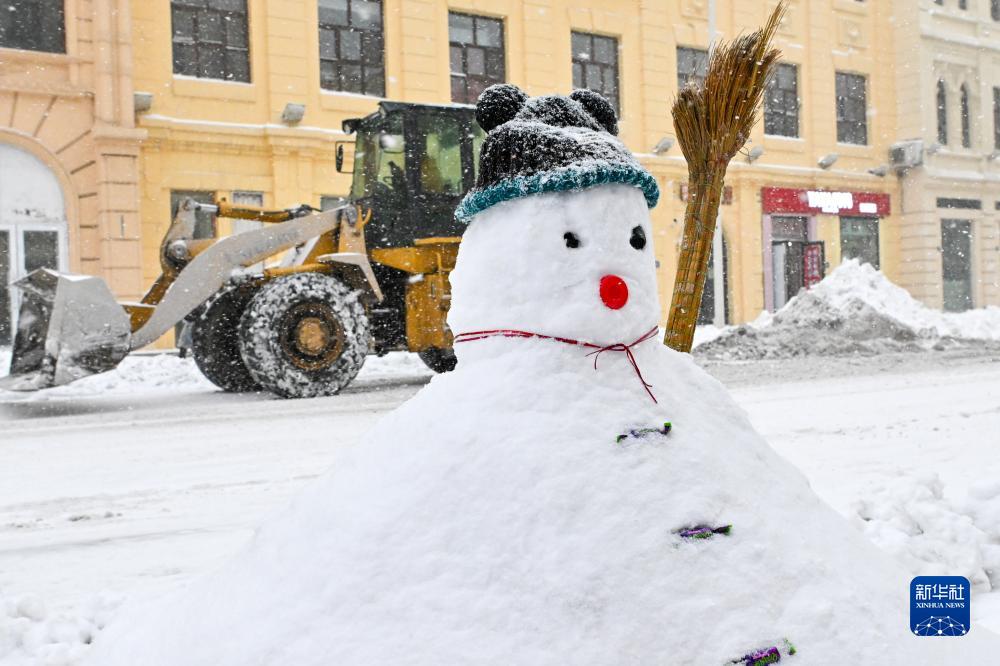 這是11月6日在哈爾濱中央大街附近拍攝的雪人,鏟雪車(chē)在一旁鏟除積雪。