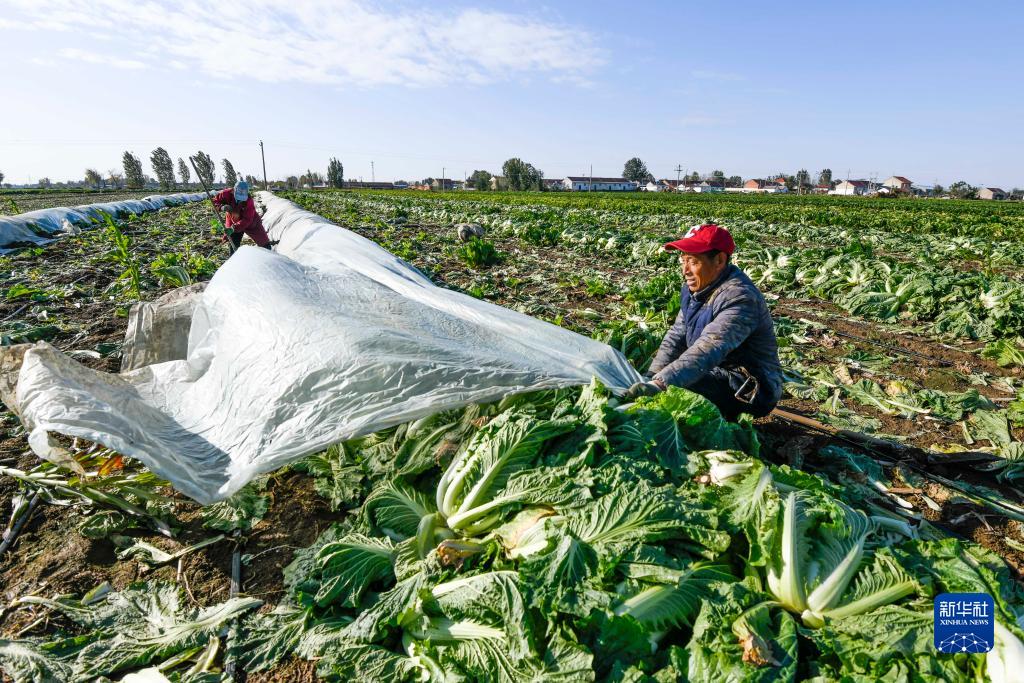 11月6日,河北省玉田縣虹橋鎮農民在苫蓋收獲的白菜。