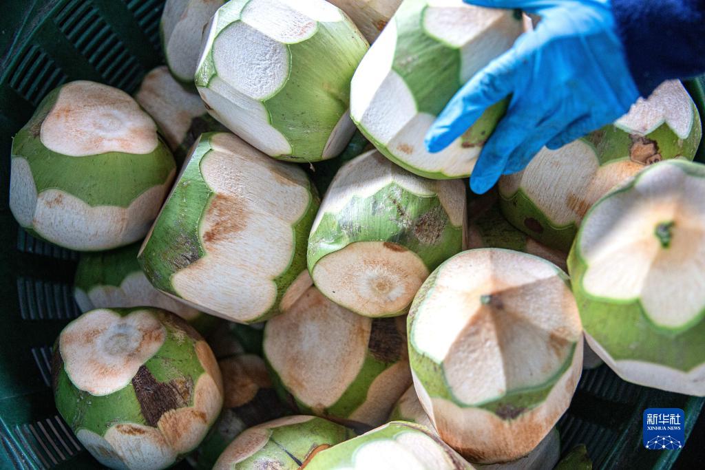 11月3日,工人在泰國叻武里府丹嫩沙多的椰子工廠(chǎng)碼放椰子。
