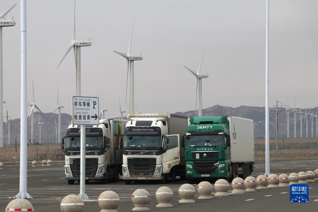 11月5日,入境貨車(chē)在阿拉山口公路口岸停車(chē)場(chǎng)等待檢查結果。