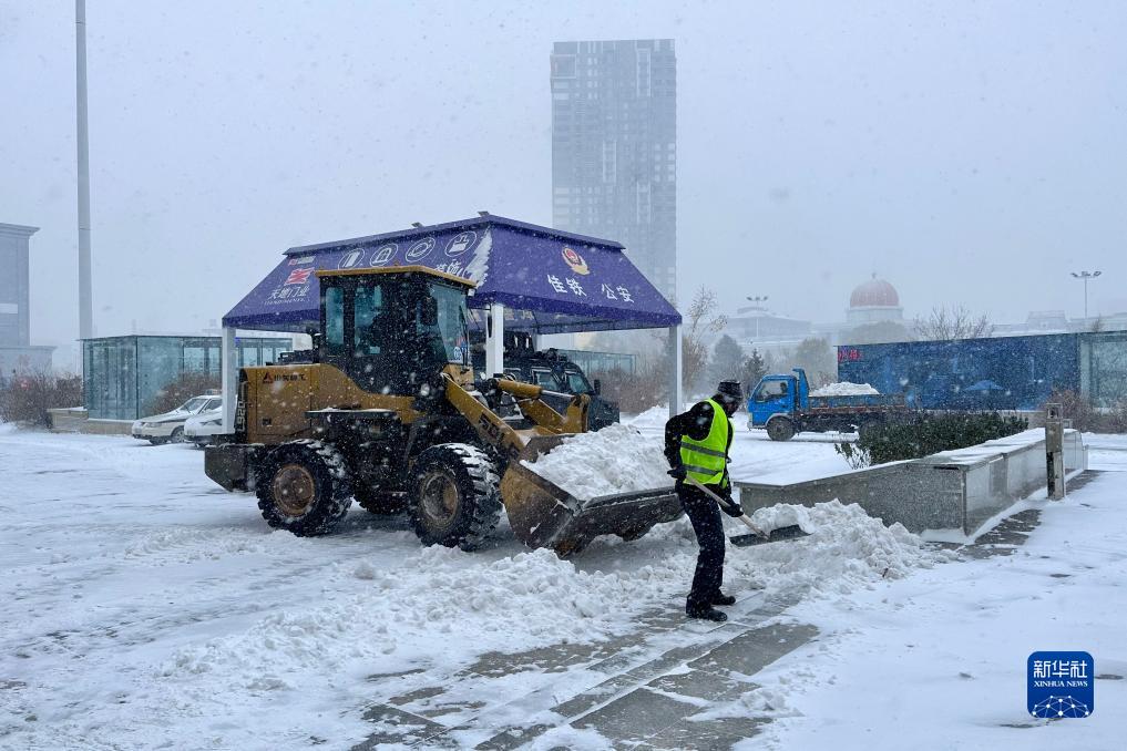 11月6日,在黑龍江省佳木斯市,工作人員在佳木斯站前清理積雪。