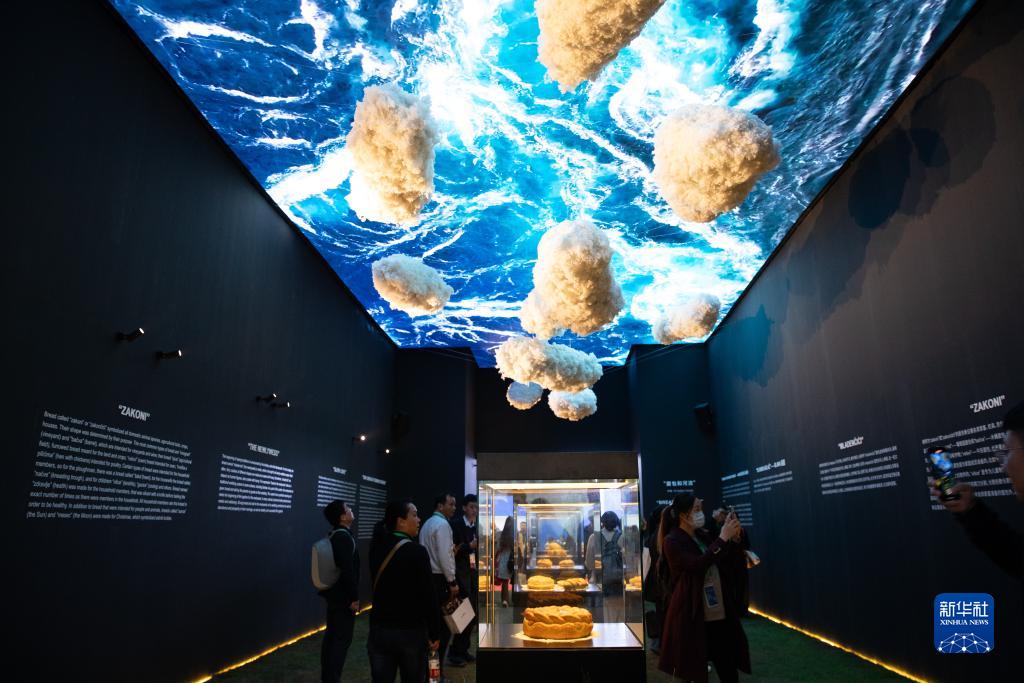 11月6日,參觀(guān)者在第六屆進(jìn)博會(huì )國家展塞爾維亞展臺欣賞塞爾維亞面包。