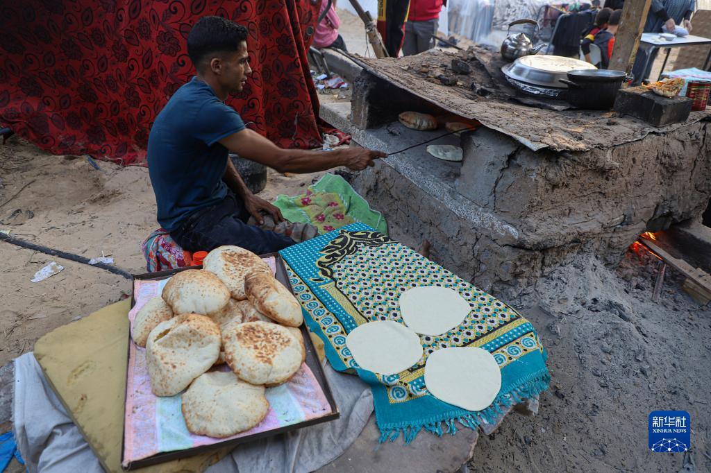 11月6日,因缺乏燃料,在加沙地帶南部城市汗尤尼斯的一處臨時(shí)難民營(yíng),人們用粘土砌成的爐子烤制面包。