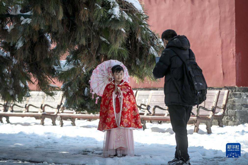 11月7日,游客在雪后的沈陽(yáng)故宮游覽拍照。