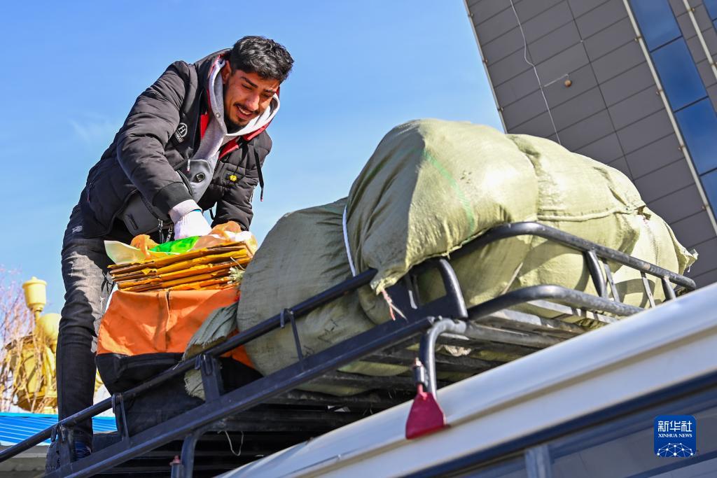在新疆紅其拉甫口岸,出境旅客將行李固定在車(chē)上(11月6日攝)。