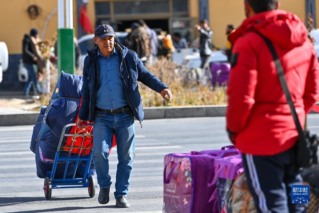 出境旅客攜帶行李前往新疆紅其拉甫口岸聯(lián)檢大廳(11月6日攝)。