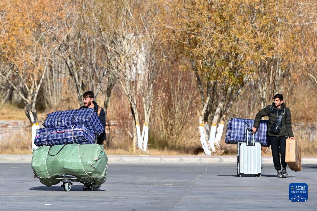 出境旅客攜帶行李前往新疆紅其拉甫口岸聯(lián)檢大廳(11月6日攝)。
